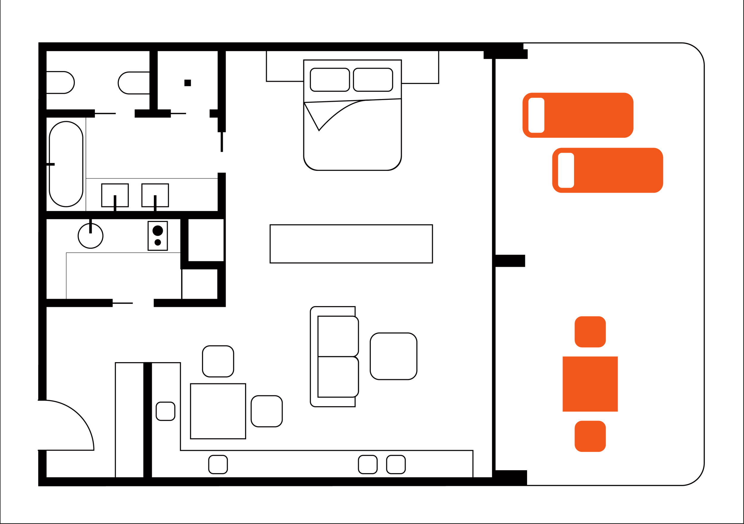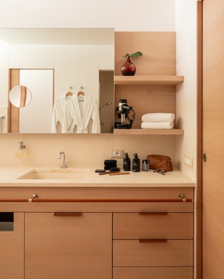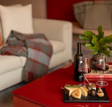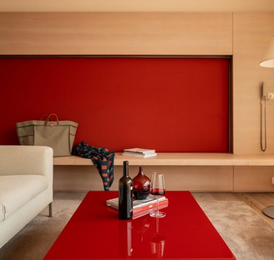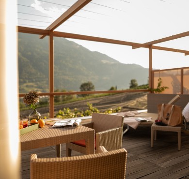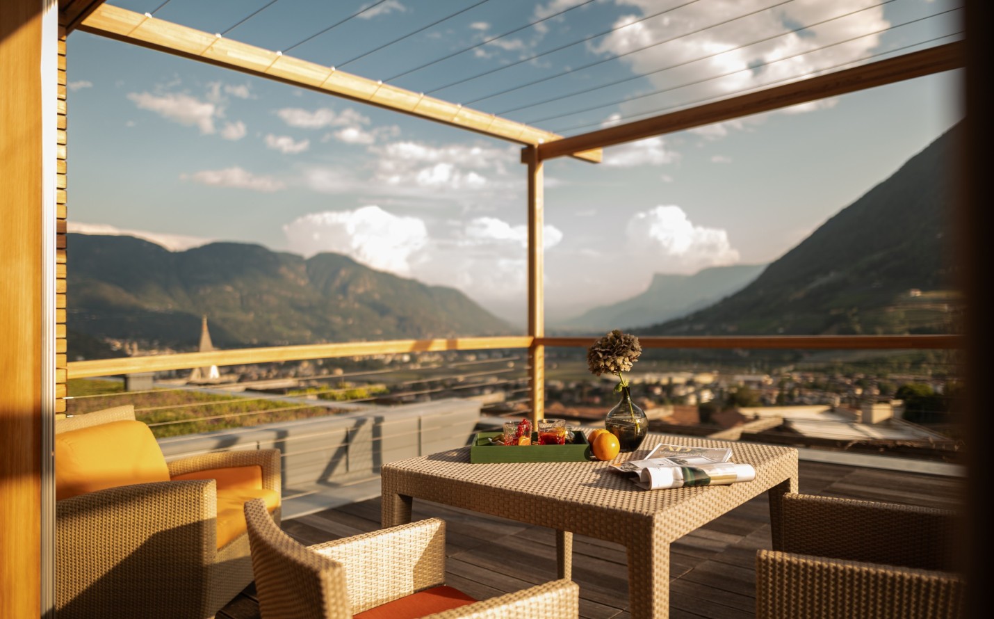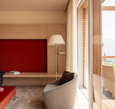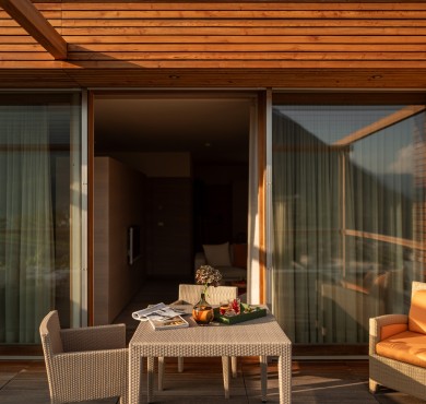Freie Sicht in den Süden und in den Osten, wo keine andere Suite angrenzt. Rundherum Berge, Täler, in der Ferne Dörfer und Weiler, Hänge und Hügel, ganz nah Reben, Palmen, Zypressen und Apfelbäume. Viel Zeit und viel Platz für lichte Momente und Reserviertheit.