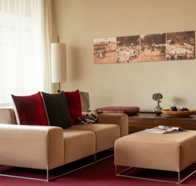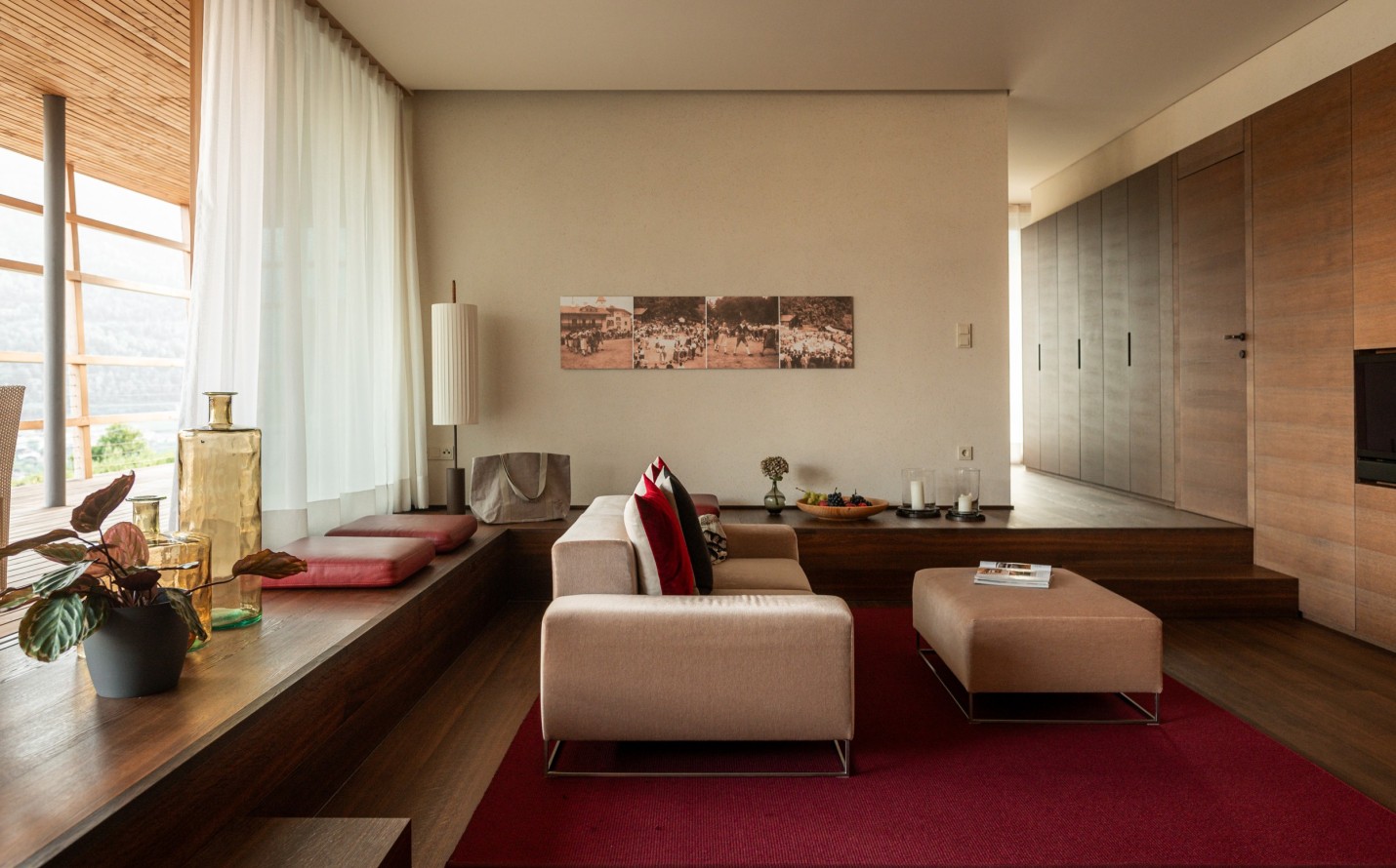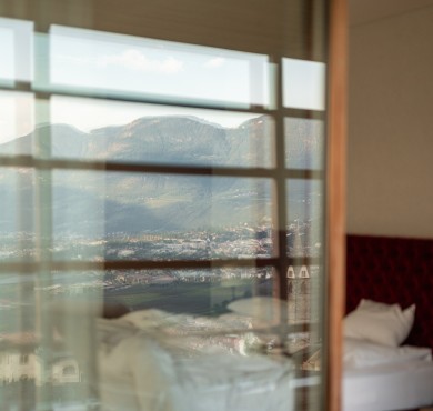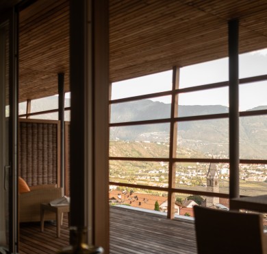 Blick nach Süden ins Tal und westwärts auf Gipfel und Anhöhen, Rundumterrasse für Sonnenuntergänge und absolute Privatsphäre. Der Aufzug fährt von der Tiefgarage direkt hoch. Freie Sicht und Licht, Ruhe und Komfort in der größten Wohneinheit der Pergola Residence.