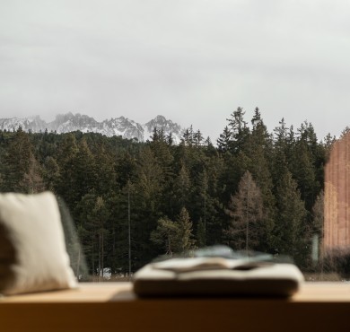 Sala lettura con vista sul bosco e divano letto